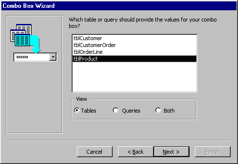 values of the combo box will come from. Click Next > and choose fields from