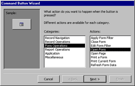 draw the button on the form. The Command Button Wizard will then appear. |
