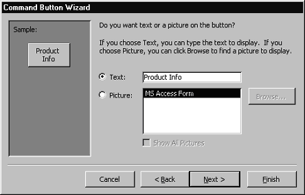 in each category. Select an action for the command button and click Next >. |