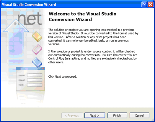 | Click Next to proceed through the wizard, accepting all defaults. Visual Studio 2005 will convert the solution and its contained project files to use the MSBuild format, which is the new project file format in Visual Studio 2005. |