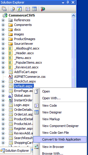 | For migrating your code to use partial-class model, first make sure that your code compiles without errors. Then in Solution Explorer, right-click the project name and click âConvert to Web Application?. This command iterates through each page and user control in the project, moves all control declarations to a .designer.cs file, and adds event handler declarations to the server-control markup in the .aspx and .ascx files. |