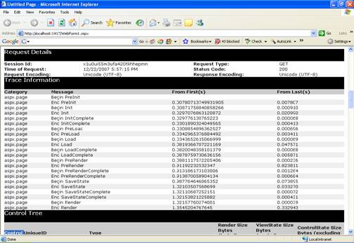 Control Tree: Control tree presents an HTML representation of the ASP.NET Control Tree. Shows each control's ID, run time type, the number of bytes it took to be rendered, and the bytes it requires in View State and Control State.