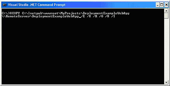 | The following screenshot illustrates the use of XCOPY deployment to deploy the Web application named DeploymentExampleWebApp to the target server named RemoteServer. |