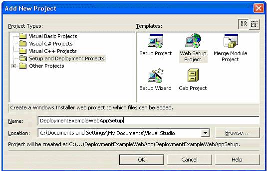 | We will start by adding a new Web Setup Project to our DeploymentExampleWebApp ASP.NET Web application solution by selecting File->Add Project-> New Project from the menu. In the New Project dialog box, select Setup and Deployment Projects from the Project Types pane and then select Web Setup Project in the Templates pane as shown in the following figure. |