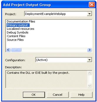 | After creating the project, you then need to add the output of the primary assembly and the content files of the ASP.NET Web application to the setup project. To do this, right click on the DeploymentExampleWebAppSetup project in the solution explorer and select Add->Project Output from the context menu. In the Add Project Output Group dialog box, select DeploymentExampleWebApp from the Project combo box and select Primary Output from the list. |
