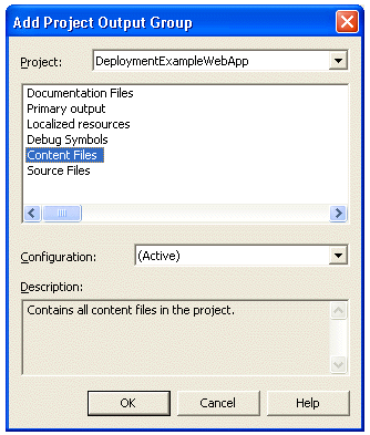 | After adding the project output, you then need to add the related Content Files (such as .aspx files, Images, and so on) to the project. To do this, again bring up the Add Project Output dialog box and then select Content Files from the list this time. It is illustrated in the following screenshot. |