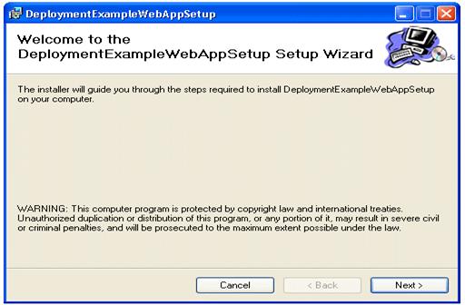 | Once you have created the Windows installer file (.msi file), then installing the ASP.NET application in the target servers is very straightforward. All you need to do is to double-click on the .msi file from the Windows explorer. This will initiate the setup wizard, which will walk you through the installation steps. The following screenshot shows the first dialog box displayed during the installation. |