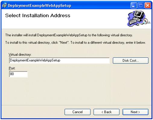 | Clicking on Next in the above dialog box results in the following dialog box, where you can specify the virtual directory that will be used to host this Web application. This is one of the handy features wherein the creation of virtual directory is completely automated obviating the need for manual intervention. In part two of this article, we will see how to set specific properties (such as Directory Security, Default Document and so on) on the virtual directory as part of the installation process. |