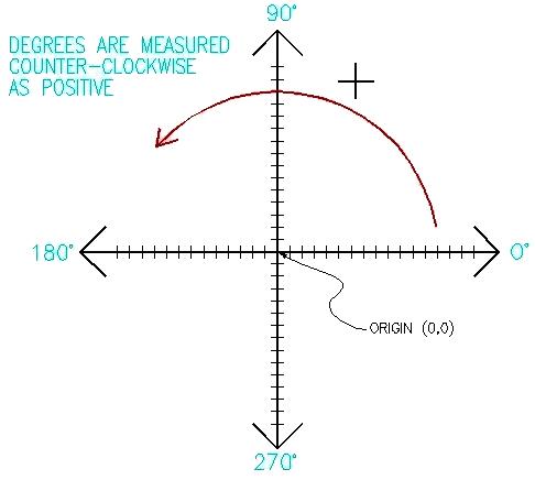 AutoCAD measures angles in a particular way also. Look at the diagram below and then place your mouse on it to see how this is done.  |