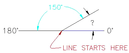 | In this example, you are given information about the lines, but not the angle AutoCAD needs to draw the line from the start point. What you are given though, is (a) the knowledge that 0° is at the 3 o'clock position (b) the knowledge that 180° is at the 9 o'clock position and (c) the angle between 180° and the line you want to draw is 150°. With this information, you can figure out what angle you need. Here is a fool-proof way of getting the angle you need: |
