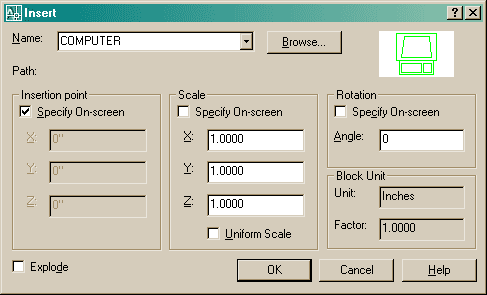| Make sure that the Insertion Point - Specify On-screen box is checked, and the Explode button is not checked. The Scale - Specify On-screen should not be checked. Then press the OK button. Pick anywhere on your screen and you will see the block appear. |