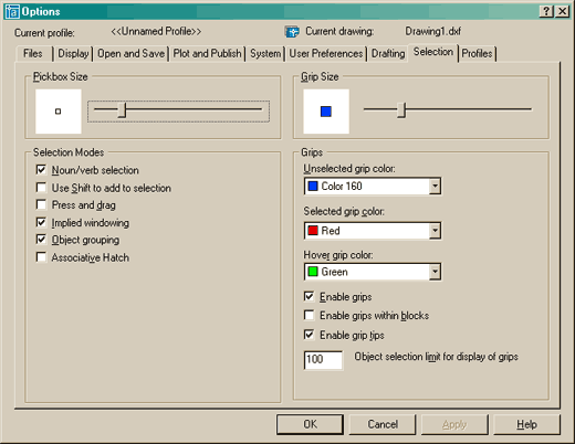 | The look of your grips can be changed by entering the DDGRIPS command. You'll see this dialog box (it's the Options dialog box: Selection tab): |