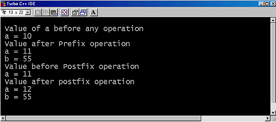 | In prefix operations the value of operator is incremented or decremented first and then the expression is evaluated. Prefix operators has the effect of Change then use. |