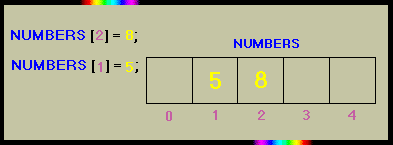| We created an array called names, which has space for four integer variables. You may also see that we stored 0 in the last space of the array. |