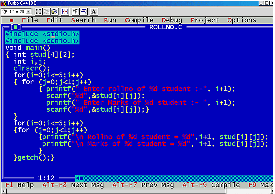 | An example program that stores roll number and marks obtained by a student side by side in Matrix: |