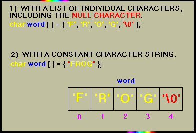 | The last element is filled with a zero value, to signify the end of the character string (in C, there is no string type, so character based arrays are used to hold strings). |