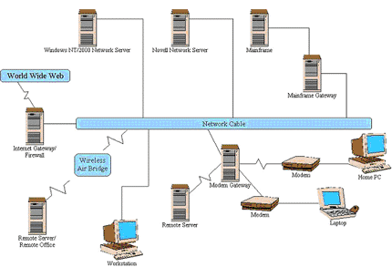 | Higher powered computers called servers - These are the machines that provide what network administrators call services. Services include the functions that most people try to use such as email, reading and writing files, printing, and getting to the internet. Whenever a user is trying to do something on the network, there is a service or machine providing the capability to do so. This even includes times when someone is trying to get to network resources from their home. |