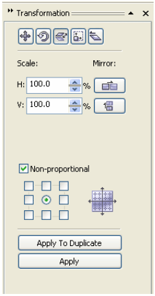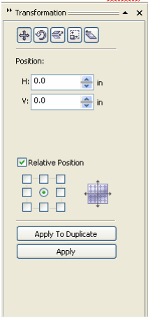 | Note: If you enable the Relative position check box on the Transformations docker, the H and V boxes identify the position of the center anchor point as 0,0. On specifying different values in the H and V boxes, the values represent a change from the object's current position as measured from the center anchor point. |