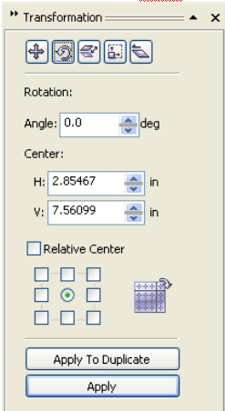 | . Disable the Relative center check box. For rotating an object around a point relative to its current position, enable the Relative center check box. |