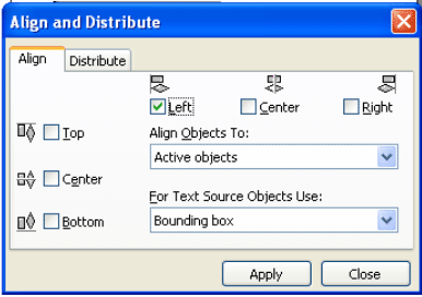 | 2. Choose Arrange > Align and Distribute or click the Align and Distribute button at the right end of the property bar. |