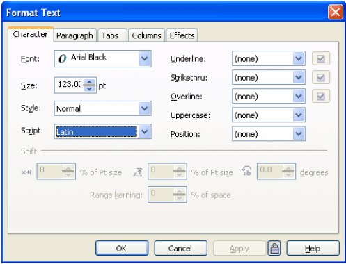 | Selected text characters can be formatted in the Edit Text dialog box--my favorite shortcut to get there is Ctrl+Shift+T. |