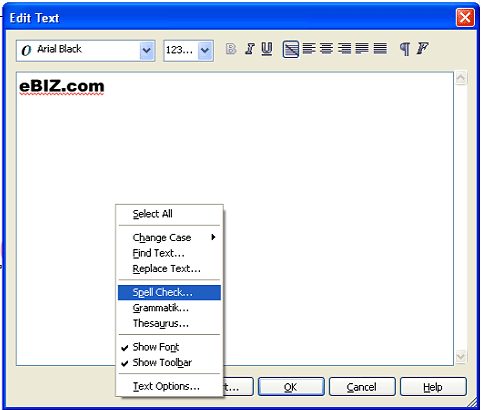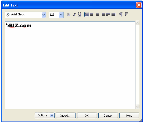| The Edit Text dialog box is a miniword processor in a window. You can insert or delete text here. And like many of the latest word processors, the Edit Text dialog box will underline words not found in the dictionary with a wavy red line. |