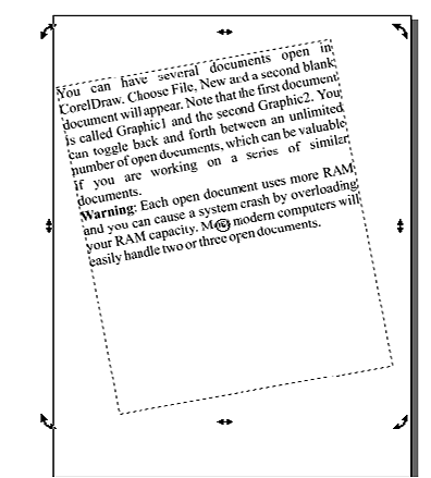 | A Text can be resized, rotated by dragging object handles. You can also move a selected object by dragging the X that appears in the middle of a selected object. To rotate text, choose the Pick tool (the one at the top of the Toolbox) and click on an object twice. As you do, the handles change from small black squares to curved arrows, as shown in Figure below. |