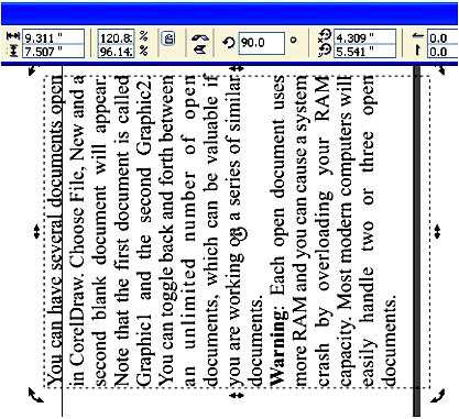 | You can also precisely define the size, location, and rotation using the Property bar. To flip text to the left, enter 90 in the Rotation Angle box in the Property bar. The results are illustrated in Figure below: |
