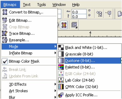 | There are four different types of duotones: monotone, duotone, tritone and quadtone. Monotones support only one color, duotones support two, tritones support three and quadtones support four. When a bitmap is converted into a duotone (8-bit), the user is prompted to first select the type of duotone that will be created and then choose the colors that will be used in the bitmap. Duotone bitmaps must use Pantone colors and will always output grayscale as Pantone colors cannot be reproduced using CMYK inks. In addition to this, Duotone bitmaps are typically used when color separations will be created from the document. As such, color is not required when the separations are output. |
