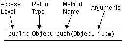 as access level, return type, name, and arguments, as illustrated here: |