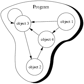 | In this figure, the program consists of only four objects. These objects send messages to each other, as indicated by the arrowed lines. Note that the third object sends itself a message. |