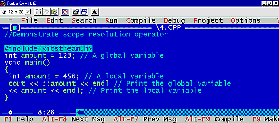 | The example above has two variables named amount. The first is global and contains the value 123. The second is local to the main function. The scope resolution operator tells the compiler to use the global amount instead of the local one. |