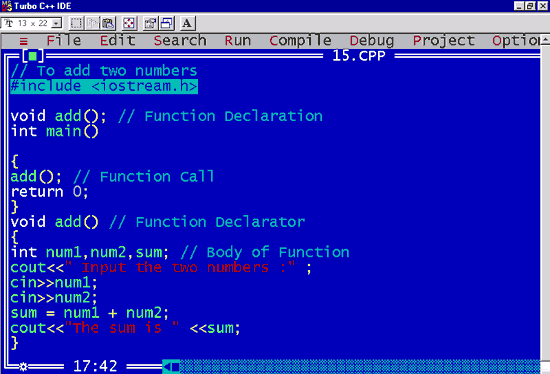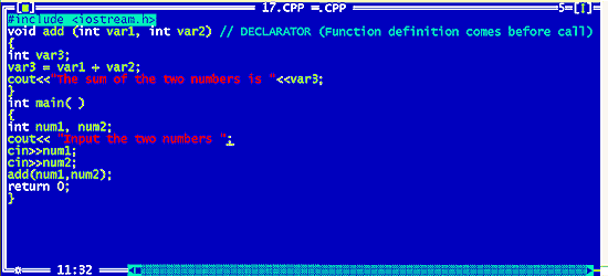 | As you can see in the above program, We have used two parameters within the function ‘add’. The function definition comes before the function call and hence We have not declared the function. Up till this point, everything is the same. |