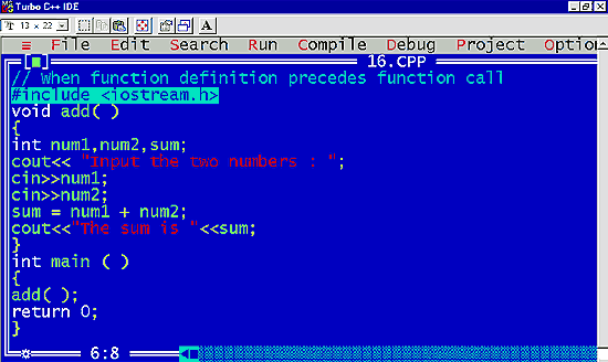 | Let us consider the same program to add two numbers using a function called add with no arguments. |