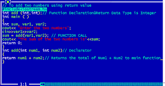 | As you can see, in the declarator instead of void we have mentioned int as return data type. This means that the function add will return (or give back) an integer quantity to the calling program (in this case the caller is main function). |