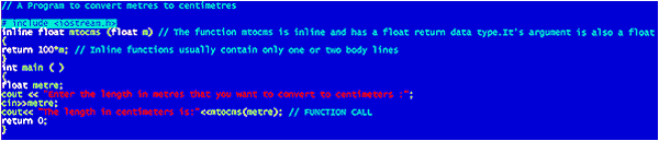 | As you can see above, the inline function is very similar to a normal function. Only difference is that you have to mention the keyword inline before the function. When the compiler comes to the function call, it knows that mtocms is an inline function. |