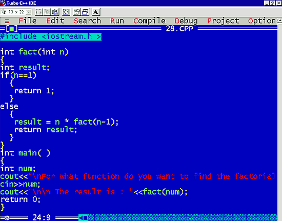 | Hence the expression in the computer will be 4*3*2*fact(1). The program calculates fact(1). When the value of ‘n’ is 1, we have specified an ‘if’ condition that says: |
