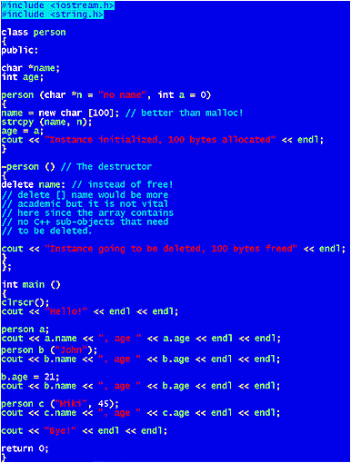 | Here we are going to introduce the destructor which is often not necessary. You can use it to do some calculation whenever an instance is destroyed or output some text for debugging. |