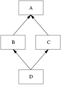 | A special type of naming conflict is introduced if a class D multiply inherits from superclasses B and C which themselves are derived from one superclass A. This leads to an inheritance graph as shown in Figure below: |