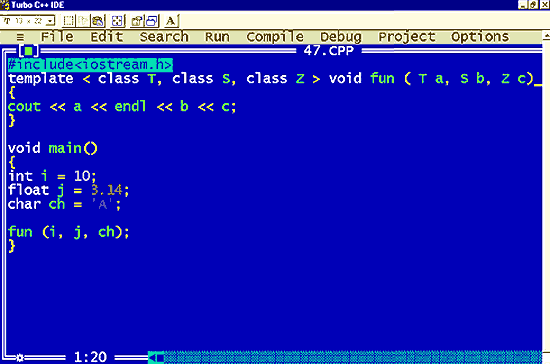 | The following program shows how to write the min() functions a template, so that it will work with any standard type. we have invoked this function from main() for different data types. |