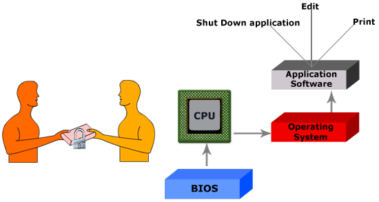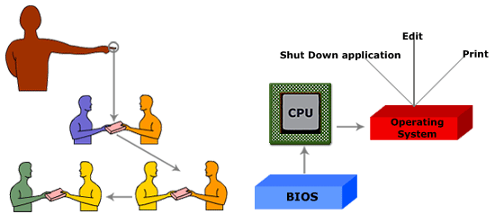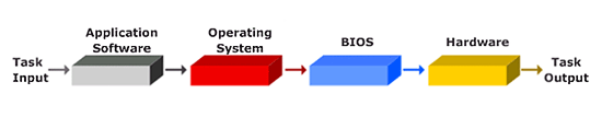 | Computer similarly gives command to fulfill the given task, which managed by OS through software and finally fulfilled by Hardware of computer under rules and regulations pre-programmed in the BIOS stored in ROM. |