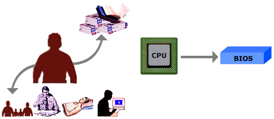 | Similarly, in computer each task basically is followed by certain pre-defined & pre-programmed rules & regulations embedded in the BIOS and stored in ROM (Read Only Memory) chip of the Computer system. |