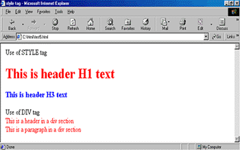 | <html> <head> <style type="text/css"> h1 {color: red} h3 {color: blue} </style> <title>style tag</title> </head> <body> Use of STYLE tag <h1>This is header H1 text </h1> <h3>This is header H3 text </h3> Use of DIV tag <div style="color:#FF0000;"> This is a header in a div section <br>This is a paragraph in a div section </div><br> </body> </html> |