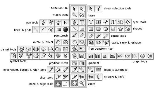 | You use tools in the Tools panel to create, select, and manipulate objects in Illustrator. Some tools have options that appear when you double-click a tool. These include tools that let you use type, and select, paint, draw, sample, edit, and move images. |
