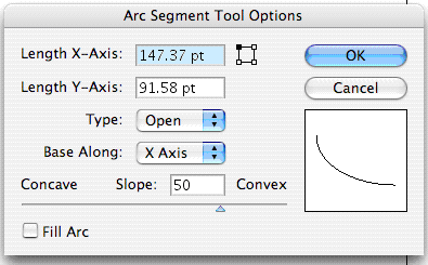 | This tool allows you to draw simple arcs and maintain tight control about how they appear. Click hold and draw on the canvas to see an Arc. Again if you hold down shift it will be constrained. Further options for the tool can be seen by double clicking the icon in the tool bar. This brings up the following menu. |