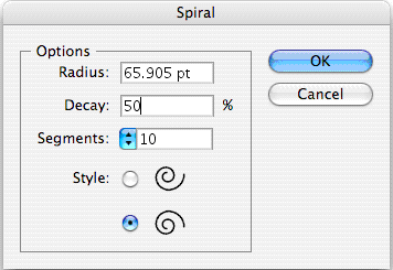 | Decay This is the amount each segment of your spiral will decay. The closer to 100% it is the more circular it will be (100% is a circle). The closer to 5% the straighter the line. |