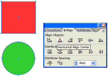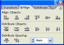| You use the Align panel (Window > Align) and the align options in the Control panel to align or distribute selected objects along the axis you specify. You can use either the object edges or anchor points as the reference point. |