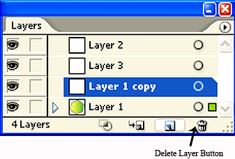 | To delete a layer, click the name of a layer and drag it to the Trash icon in the lower-right corner of the Layers palette |
