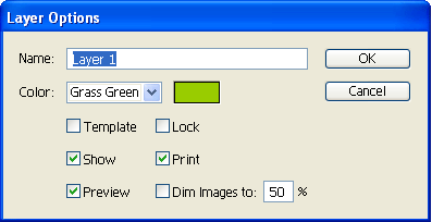 | Here you can name the layer, which is an important step. As you add more and more layers, it becomes increasingly difficult to remember which items are on Layer 23 and Layer 14. By giving intuitive names to layers, you can quickly identify where items are. In the Layer Options dialog box, you can also assign a selection color . |