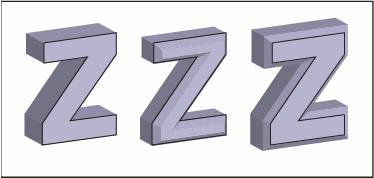 | Extruded object without a beveled edge (left) compared to object with Bevel Extent In (middle) and with Bevel Extent Out (right) |